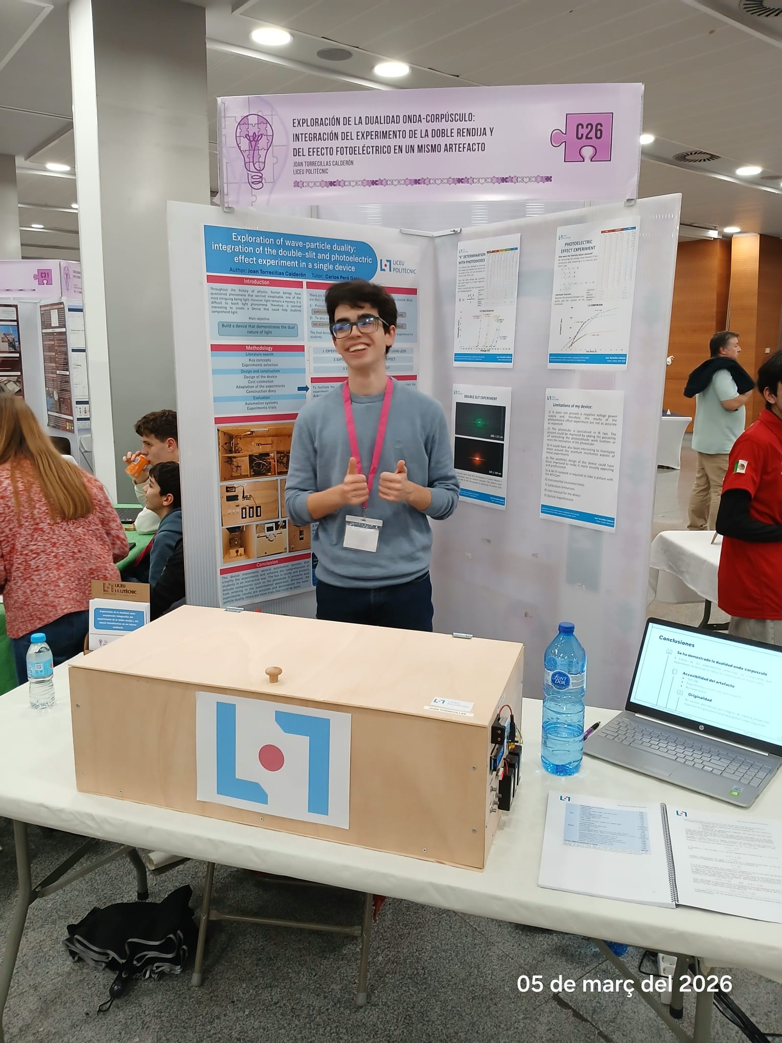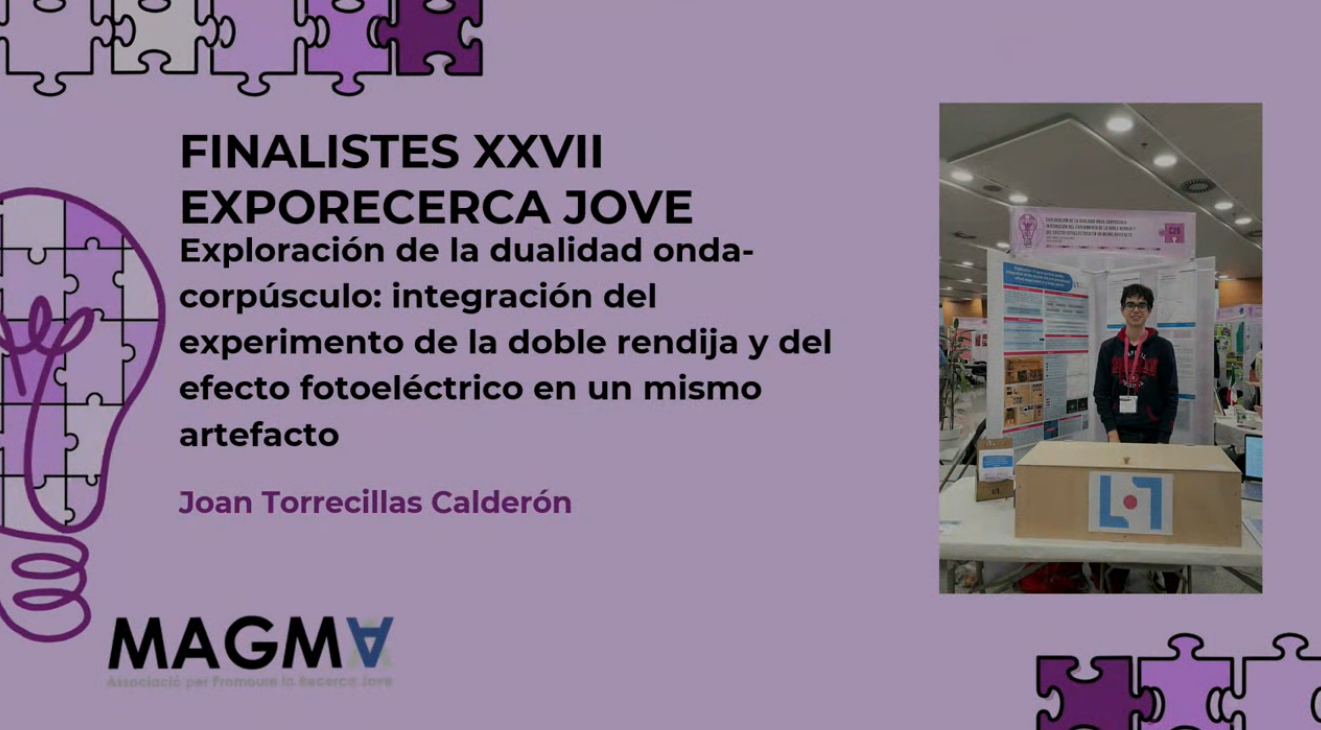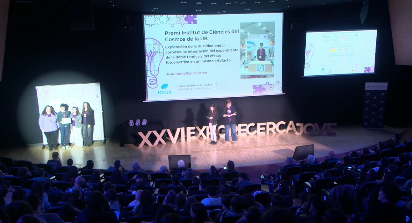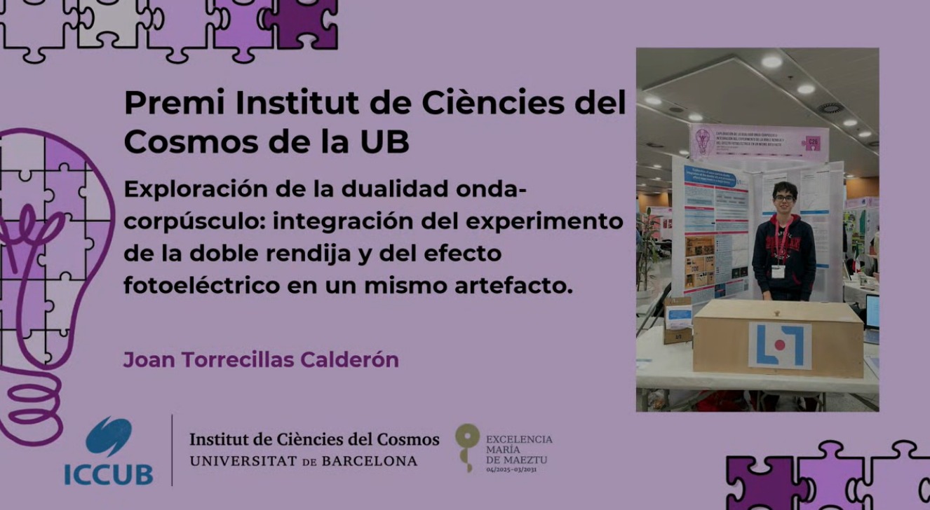 Ens alegra especialment comunicar els excel·lents resultats obtinguts pel Joan. El seu projecte, “Exploration of wave-particle duality: integration of the double-slit and photoelectric effect experiment in a single device“, ha estat seleccionat com un dels 10 finalistes de la categoria de Batxillerat, fet que li permetrà participar en la final del concurs. A més, ha estat distingit amb dos premis destacats: